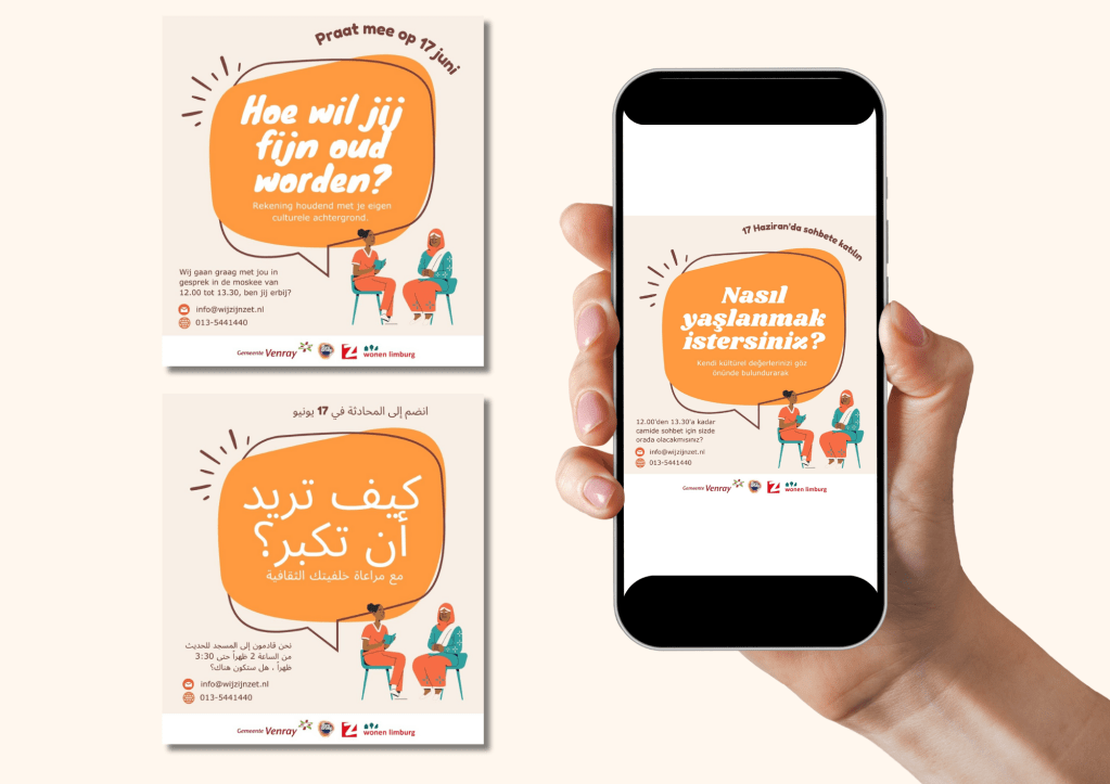 Focusgroepen in de moskeeën – De werkgroep is langsgegaan bij de Turkse en bij de Marokkaanse (met aanwezigheid van de Somalische gemeenschap) moskee waar we door middel van een interactieve focusgroep meer leerden over de behoeften van de Moslim gemeenschap van Venray rondom fijn ouder worden.