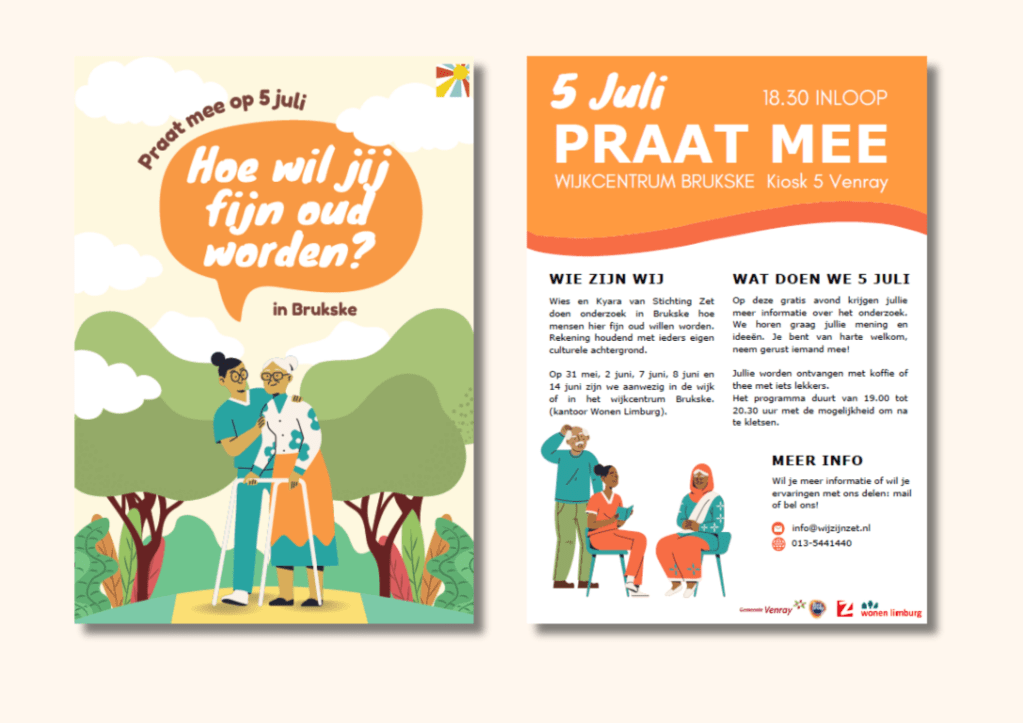 Staatgesprekken — werd de straten van Brukske op gestapt om in gesprek te gaan met de bewoners en meer te leren over hun persoonlijke perspectieven. Om hun uitdagingen rondom ouder worden te begrijpen werd er een uitgebreide verkenning in de wijk uitgevoerd, waarbij intermediairs en focusgroepen ingezet werden.
