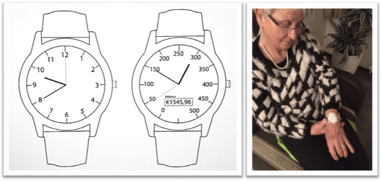 Money watch. A watch with the ability to help elderly keep track of their banking. Press the button and the watch changes so you can see your banking privately.
